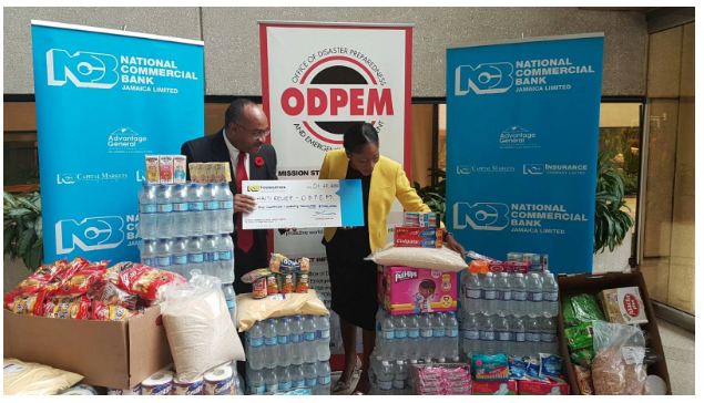The NCB staff, from several of its branch locations islandwide, contributed in cash and kind. The N.C.B. Foundation handed over a cheque to the Office of Disaster Preparedness and Emergency Management (ODPEM), along with food, water and toiletries, amounting to over JMD$2 million. ODPEM is one of the approved agencies in Jamaica handling relief efforts for the hurricane-ravaged country.