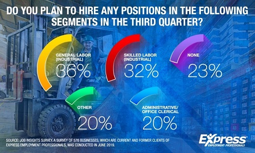 Sacramento, Calif. - Express Employment Professionals, a staffing agency in Sacramento, CA, released new survey results today showing that 77% of businesses plan to continue hiring in the third quarter of 2019—with especially strong hiring in industrial positions. In the survey, which polled business leaders, 36% of respondents also expect wage growth at their businesses.