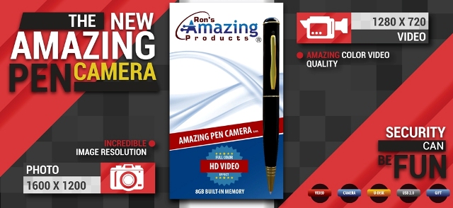 The original Spy Pen Camera featured premium HD Effect DVR with 8GB of memory built in. It has a hidden camera pinhole mini cam. The pen comes with Ron's 90 day money back guarantee, as well as a two year product warranty, and is exclusive to Ron's Amazing Products.
