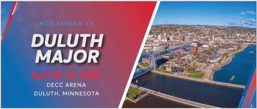 The ACO Duluth Major includes events on Friday April 18 including Seniors, Womens, and Juniors competition in the morning, Coed at noon, Bag Masters Quads at 3:00 pm, and the open to the public Big Blind Draw at 6:00 pm.